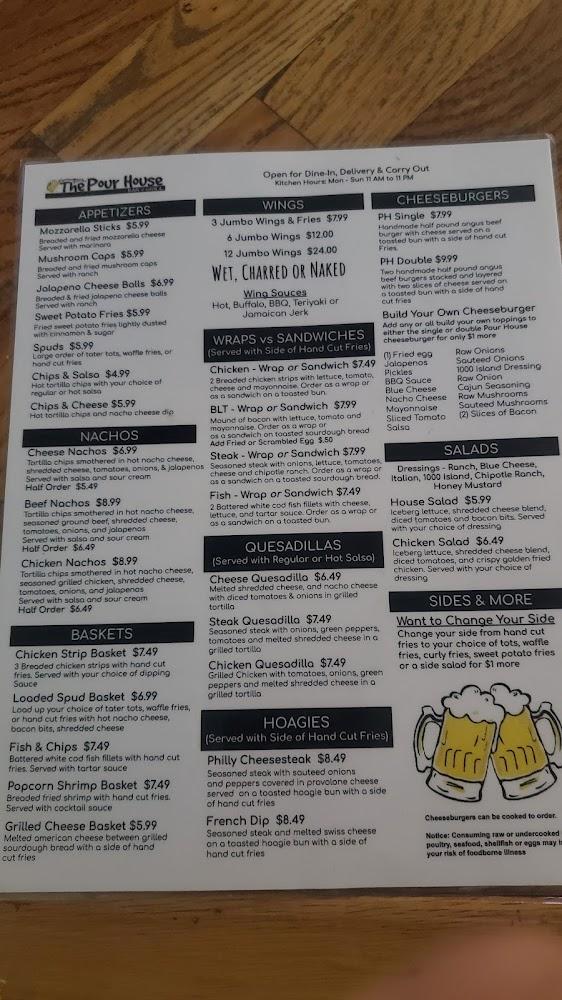 The Pour House menu boasts a delightful range of options, catering to many tastes. Burgers are a must-try, including classics like the Patty Melt. Appetizers such as Loaded Queso and mouth-watering wings top the list. For salads, Eric's Cheeseburger Salad delivers flavor and freshness. Sandwiches and wraps offer variety, like the Sriracha Chicken Sandwich. Main dishes like Chicken Fried Steak are popular. With meals priced reasonably, you can enjoy high-quality dishes without breaking the bank. This menu ensures there's something for everyone, enhancing the overall dining experience.
